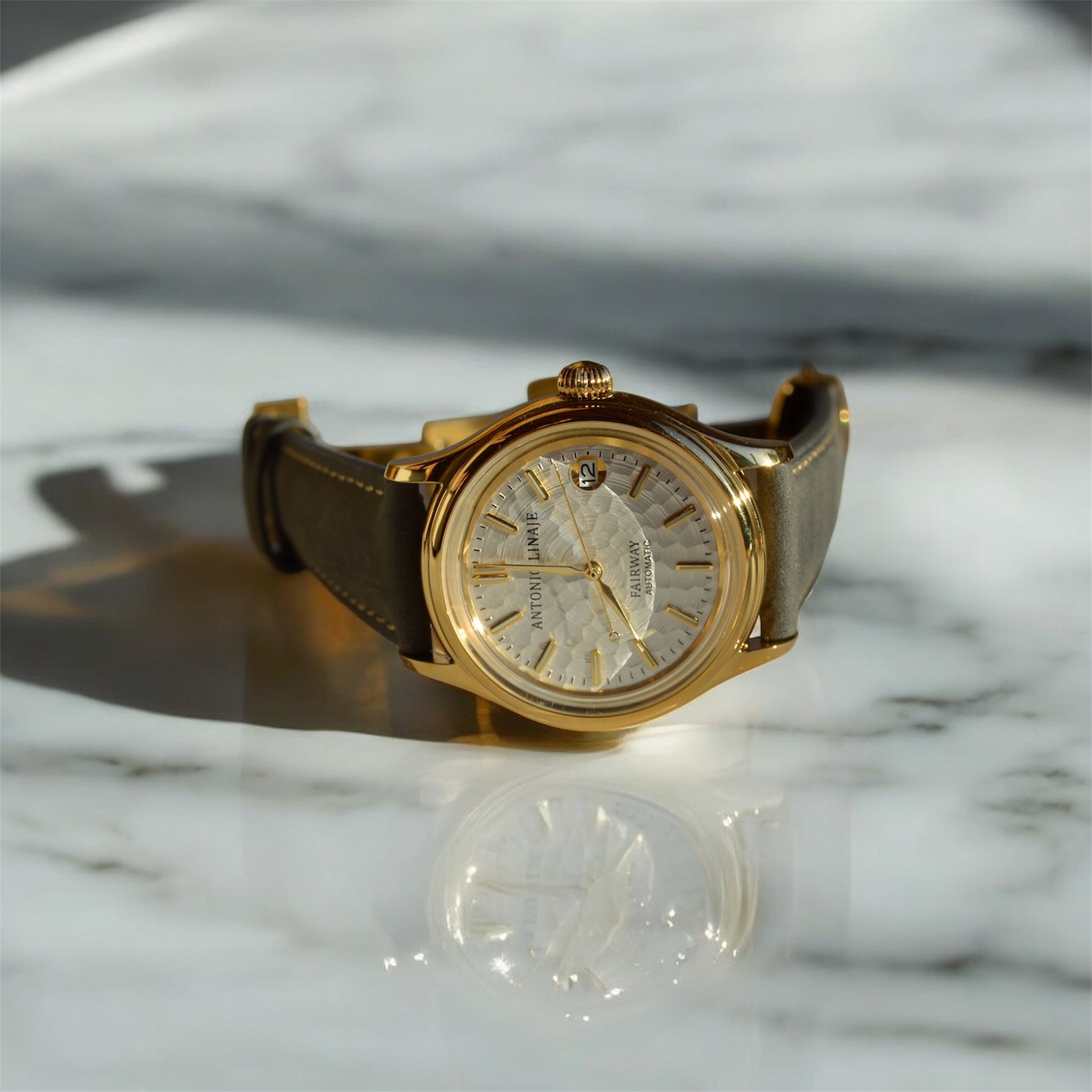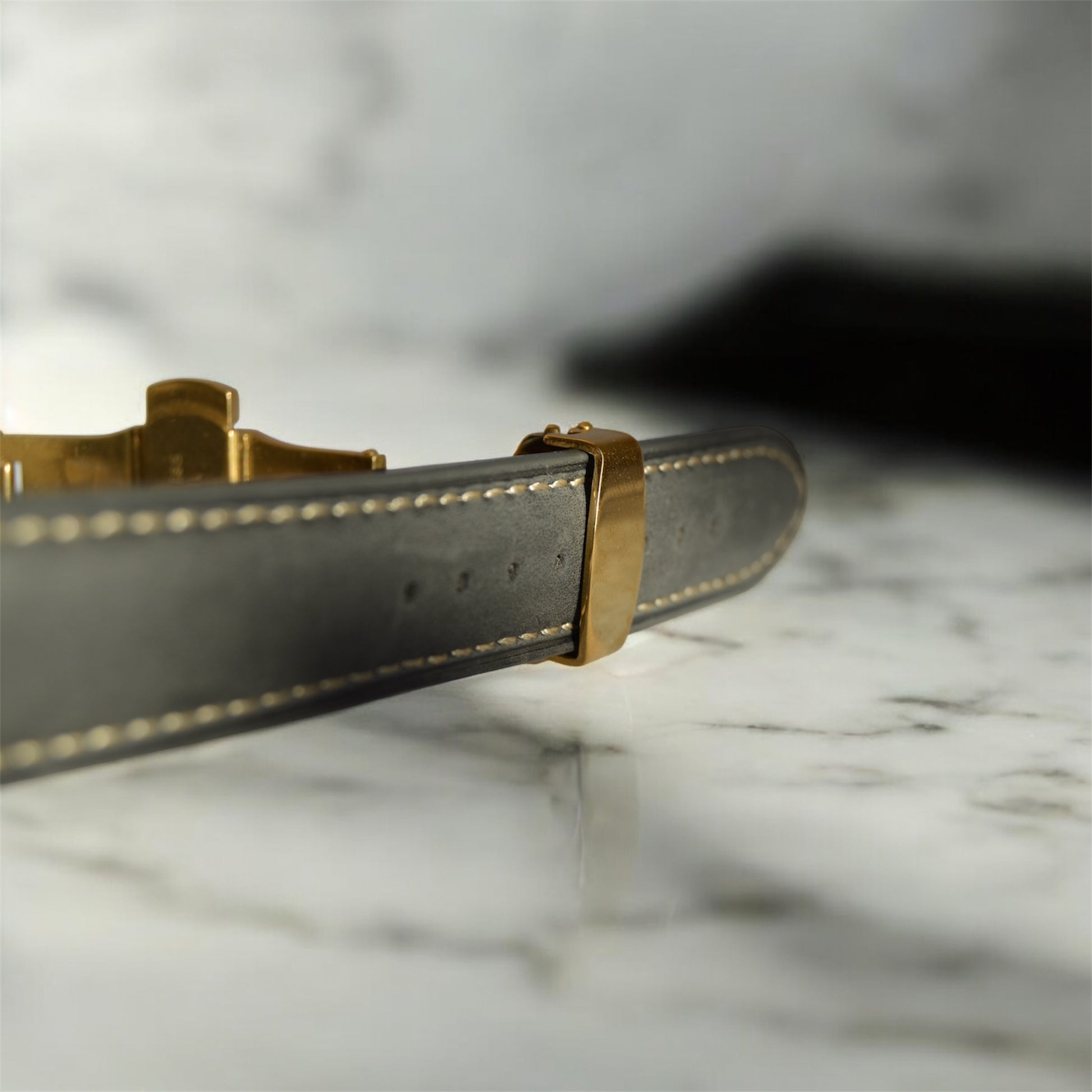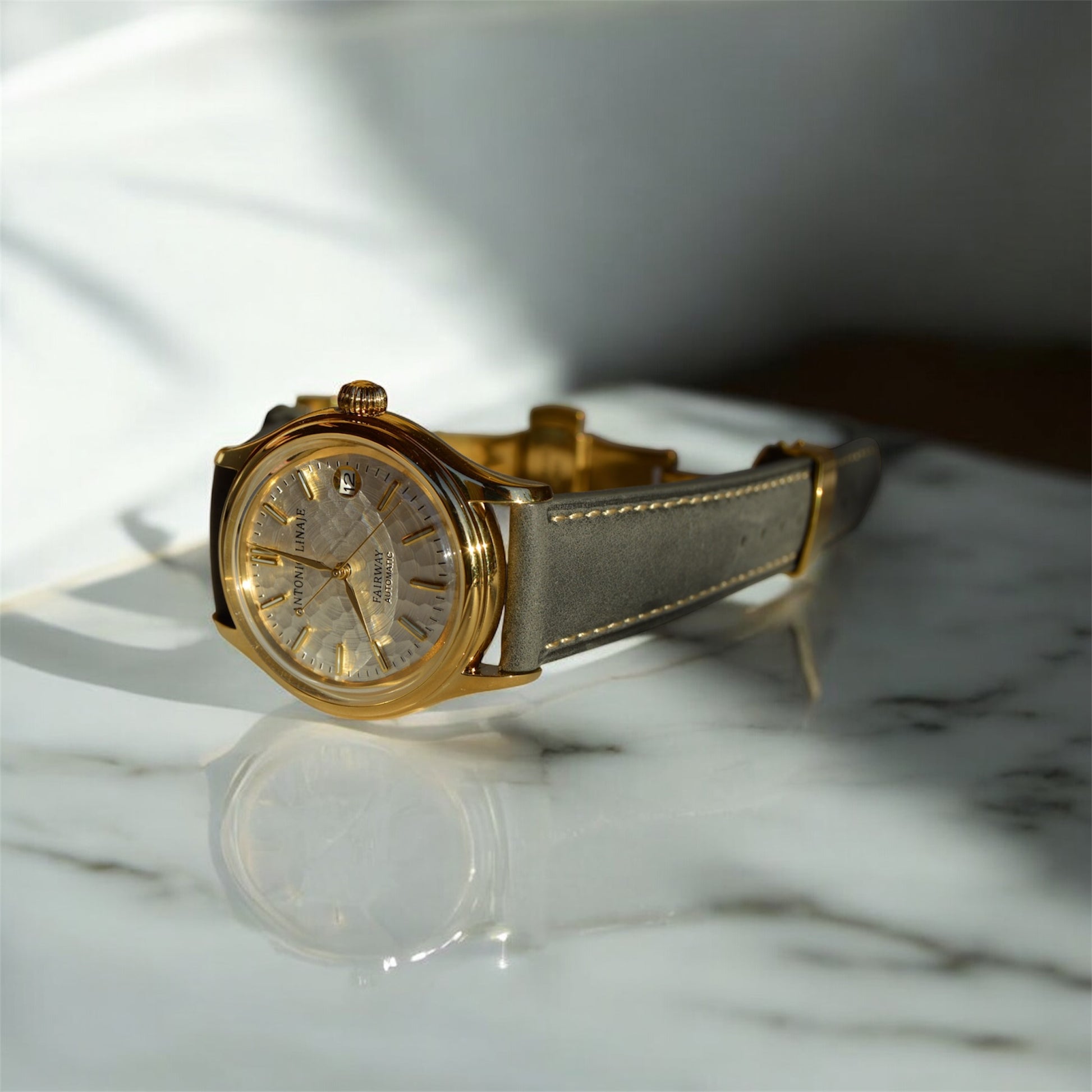 Diseño versátil: el gris neutro del cuero combina con cualquier estilo, mientras que los detalles dorados elevan su presencia en la muñeca.